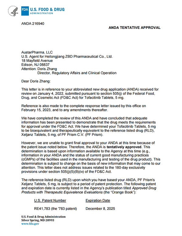 5月26日,珍寶島藥業(yè)發(fā)布公告,公司收到美國食品藥品監(jiān)督管理局(簡稱“美國FDA”)的通知,珍寶島藥業(yè)向美國FDA申報(bào)的枸櫞酸托法替布片的新藥簡略申請(qǐng)(ANDA,即美國仿制藥申請(qǐng))已獲得暫時(shí)批準(zhǔn)(暫時(shí)批準(zhǔn):指FDA已經(jīng)完成仿制藥的所有審評(píng)要求,但由于專利權(quán)或?qū)Yu權(quán)未到期而給予的一種批準(zhǔn)形式)。